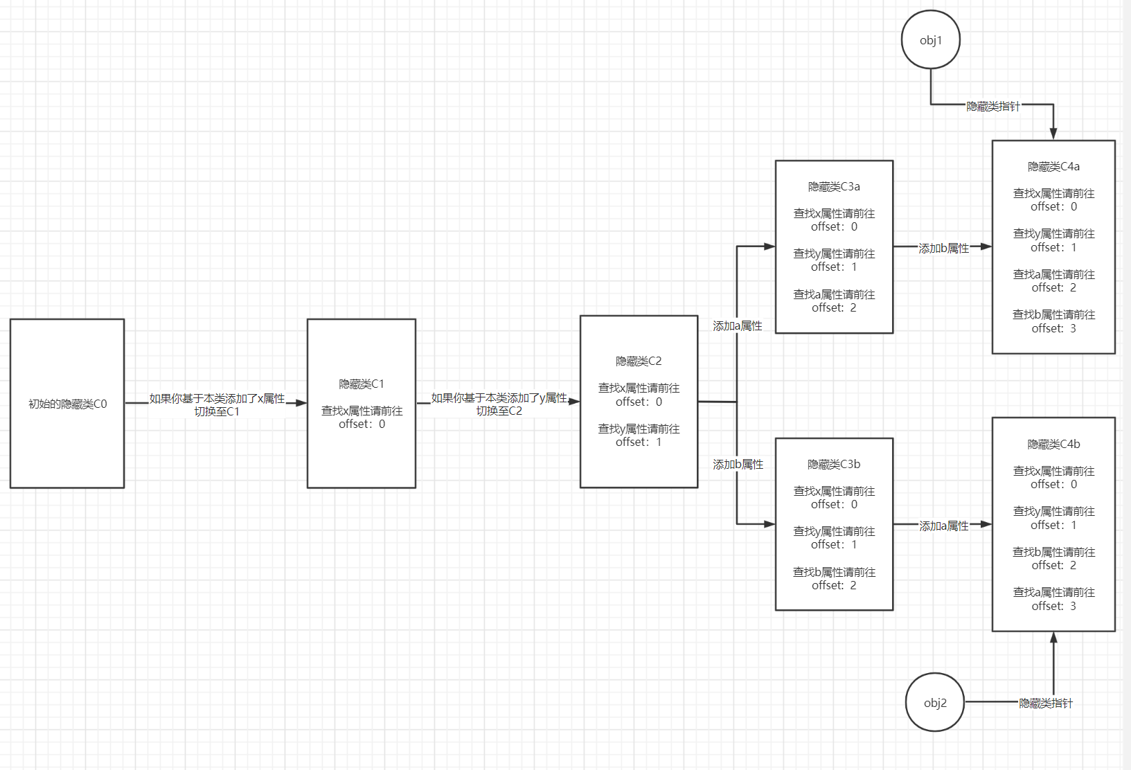 直到第6行为止,obj1和obj2都共享同一个隐藏类。但是,当属性a和b以相反的顺序添加到了两个对象中,这导致最后两个对象以不同的变换路径产生了两个不同的的隐藏类。