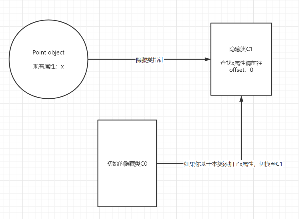 一旦第一个语句“this.x=x”被执行,V8将会基于C0创建第二个隐藏类C1。C1记录了可以找到属性x在内存中的位置。