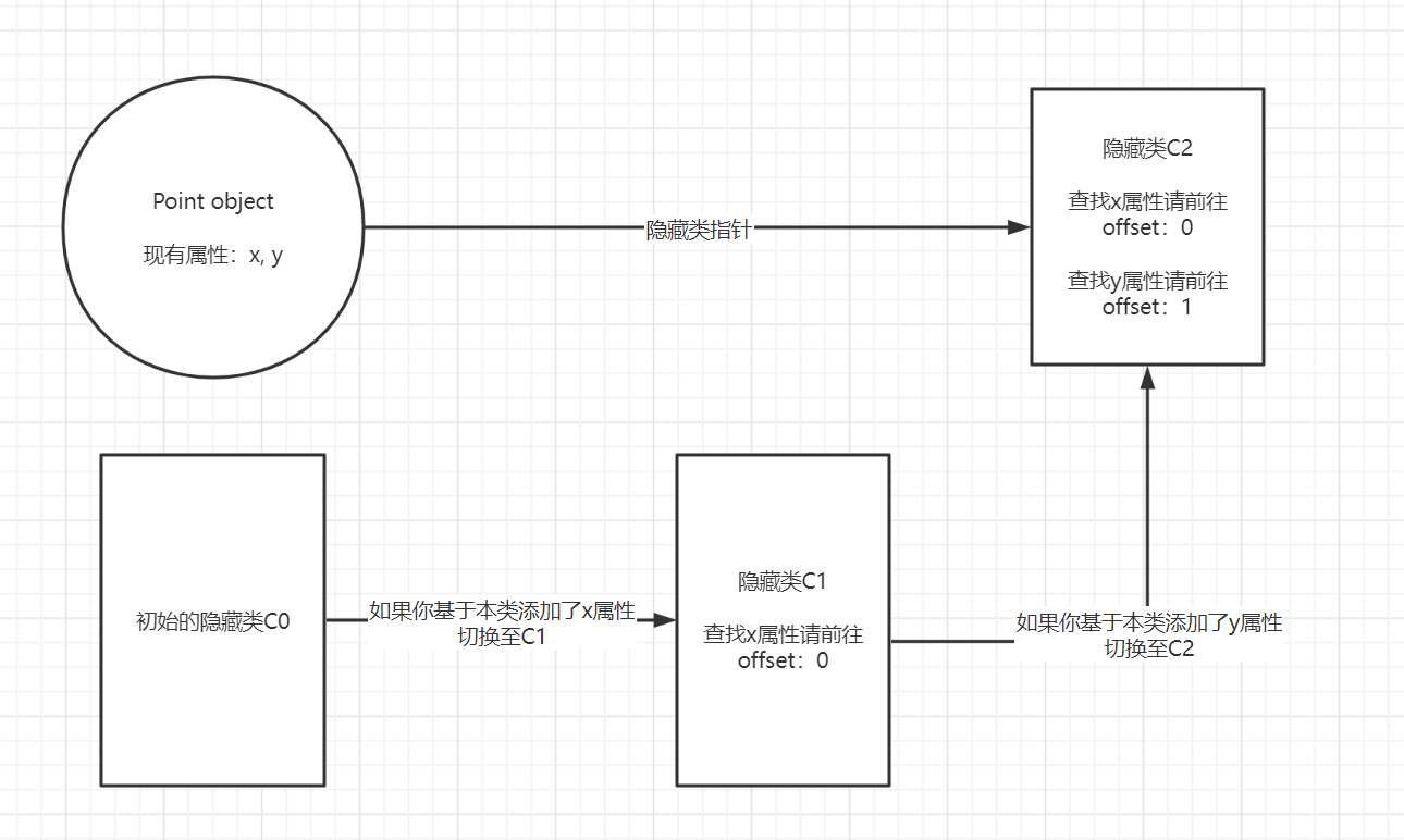 当“this.y=y”执行时将重复上面的操作。一个新的叫C2的隐藏类将被创建,然后对C1进行类变换表明属性y已经添加到了目标对象,最后将隐藏类指向C2。这样目标对象的隐藏类就更新到了C2。